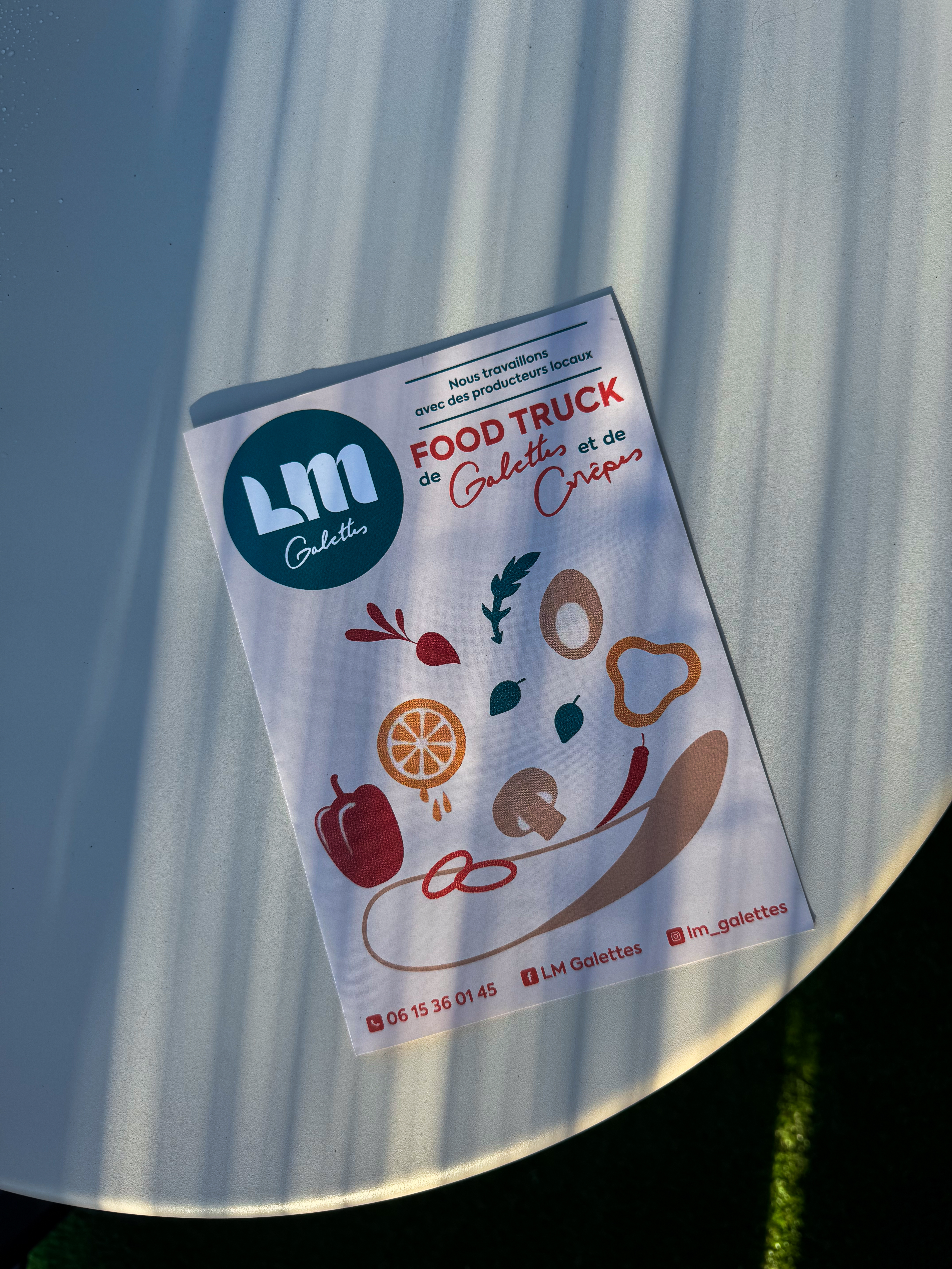 Réalisation du menu, des flyers et de la carte de visite de LM Galettes. Pour le logo et l’habillage du camion, c’est l’Atelier Bruno qui s’en est chargé !